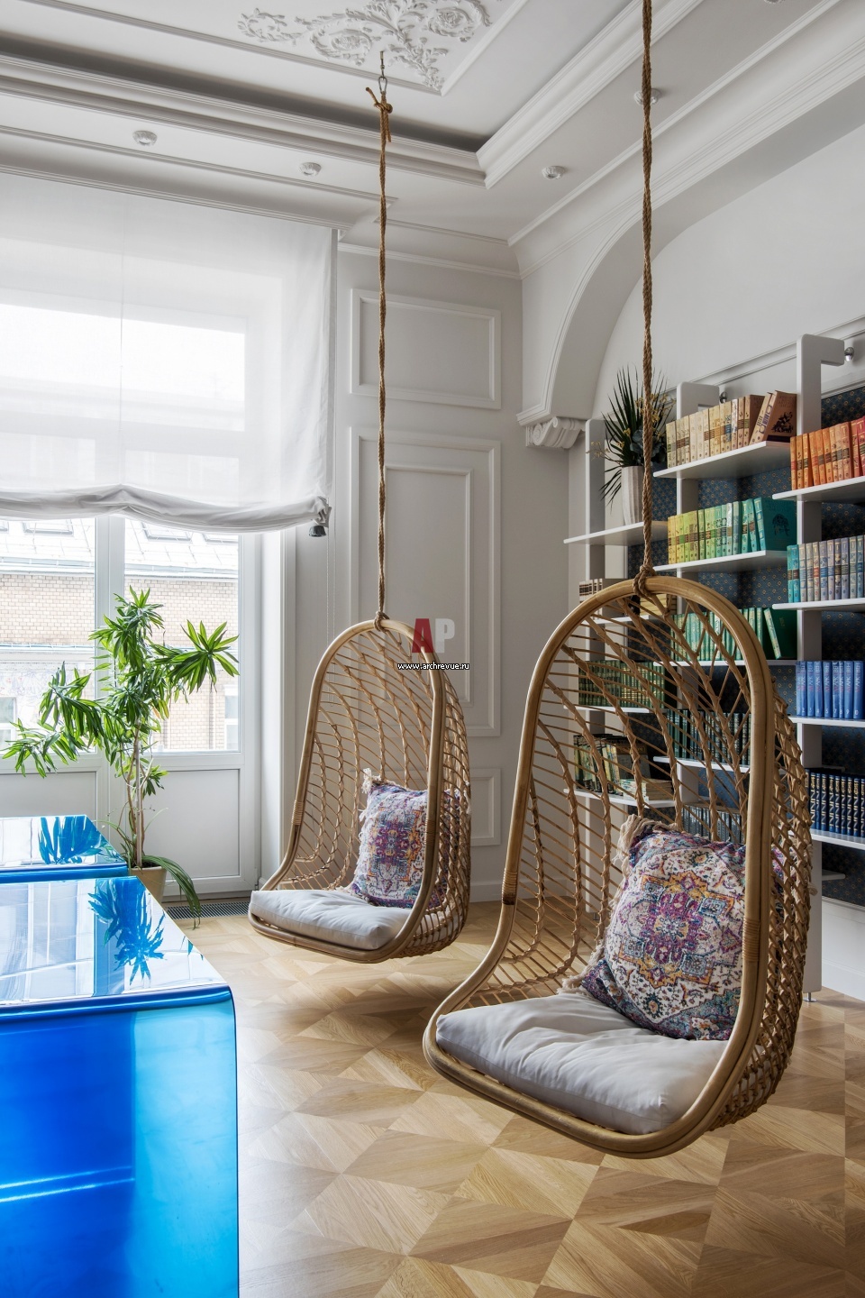 Подвесные плетеные кресла-коконы – одно из основных пожеланий заказчицы. На них вдохновили четырехметровые потолки квартиры.