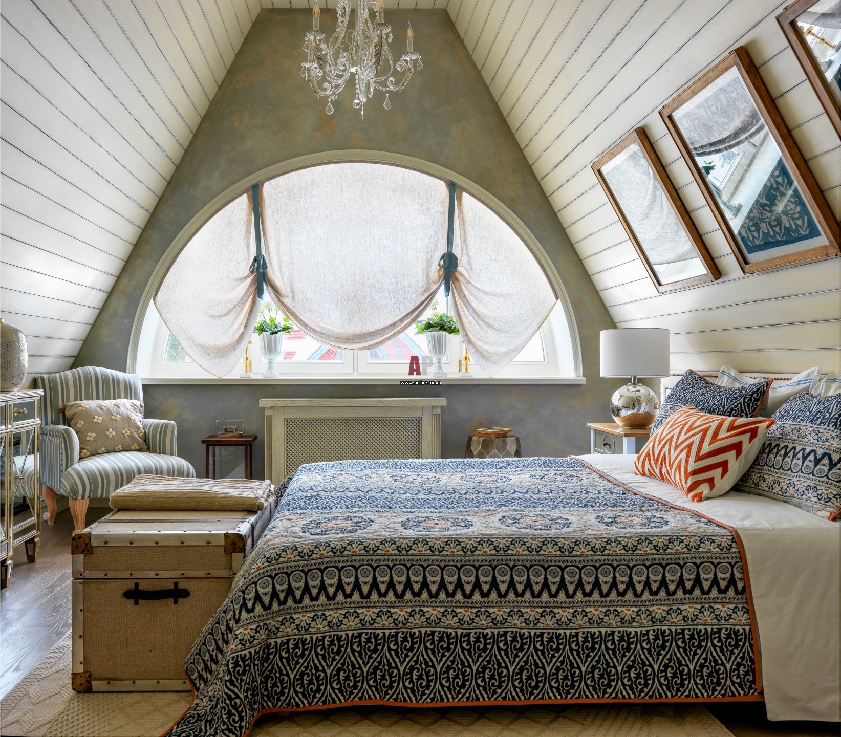 Гостевая спальня в мансарде третьего этажа с этническими мотивами.
