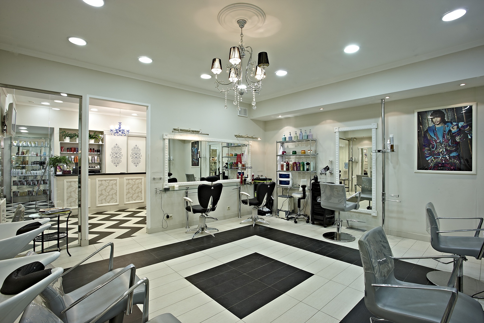 Парикмахерский зал. Стены выкрашены в сложный светло-серый оттенок. На полу – черно-белая керамическая плитка. Центральная люстра со стеклянными подвесками в классическом стиле.