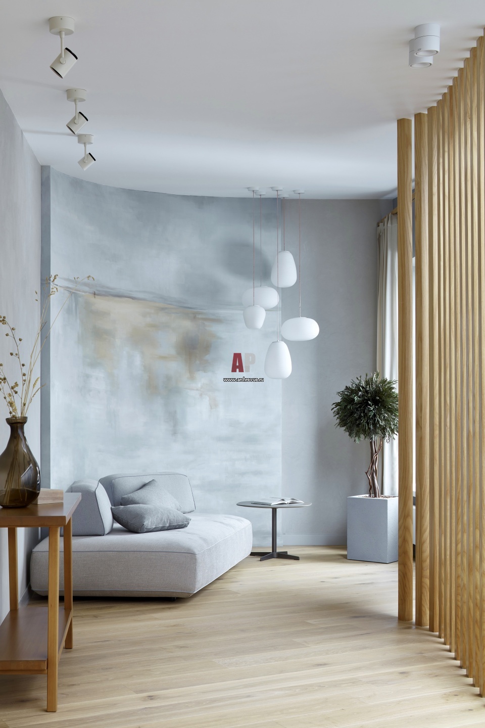 Малая гостиная или будуар в холле второго этажа. Округлая стена оформлена росписью с абстрактным рисунком на природную тему. Диван и столик, Art Nova, модель Filiphpentagonal. Светильники, Foscarini, модель Rituals.
