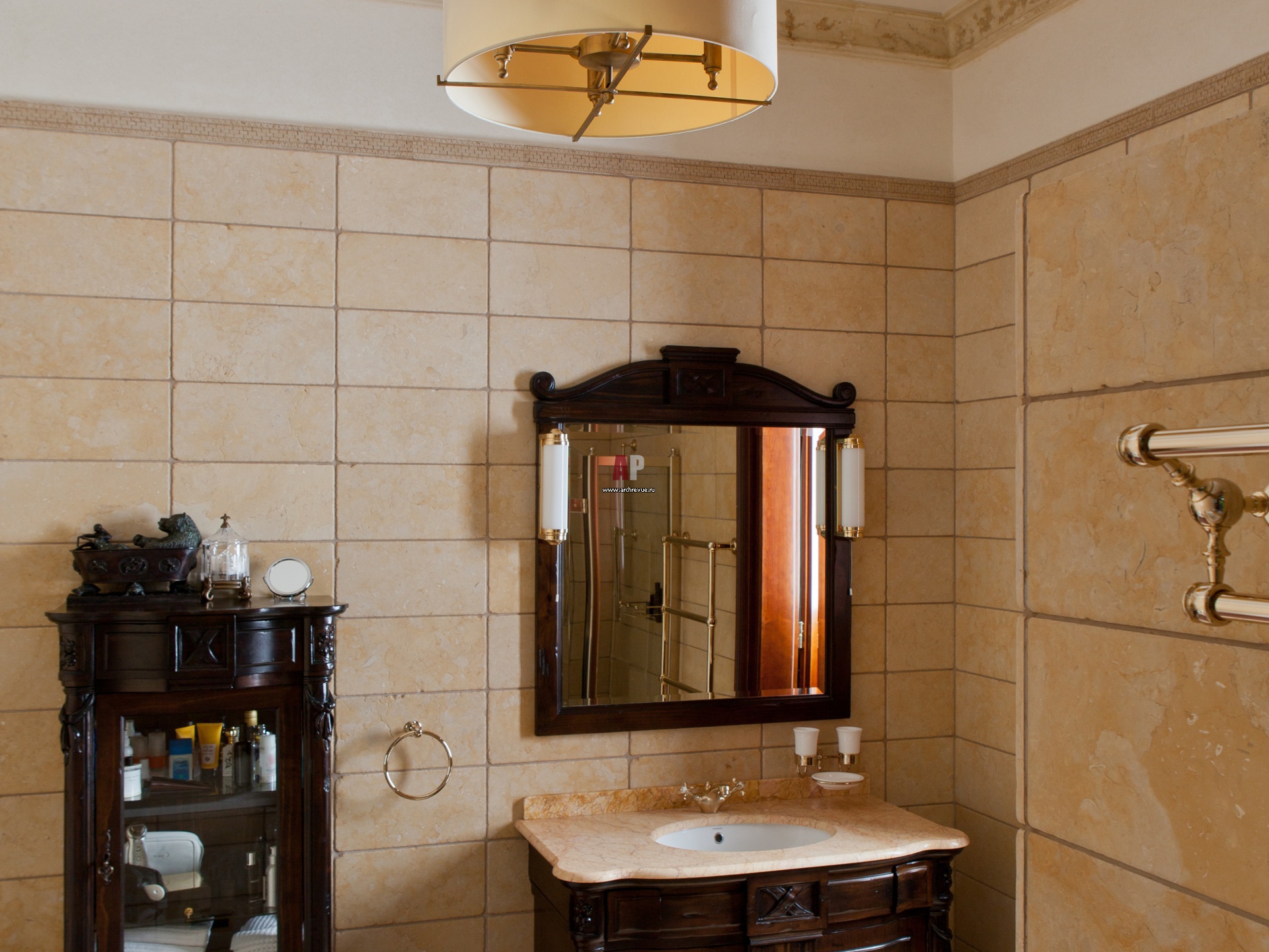 На фото – интерьер санузла в отделке из травертина. Мебель для ванных комнат и сантехника английского производства, Devon & Devon.