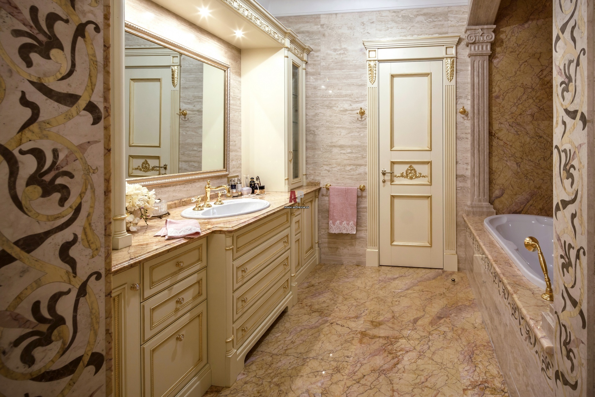 Ванная при детской девочек выдержана в романтичном стиле с венецианскими мотивами. Стены и пол облицованы бежевым камнем с инкрустацией на флористическую тему. Раковина, ванна, Villeroy & Boch.