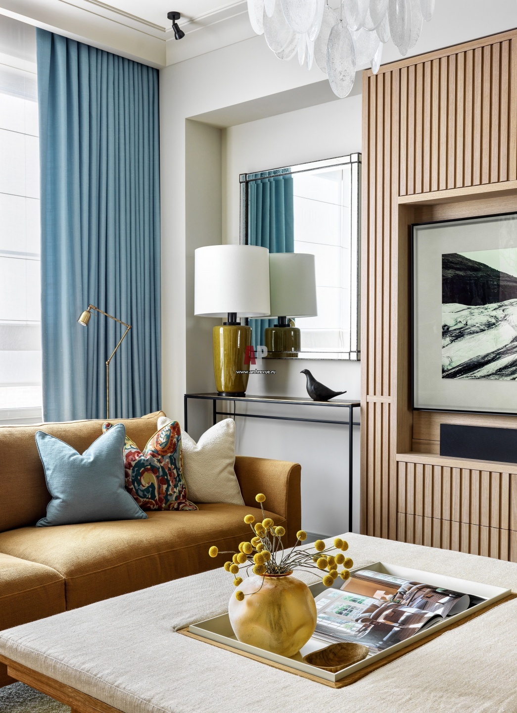 Светлая квартира в красках цветущего луга. Интерьер гостиной. Настольная лампа, Visual Comfort & Co. Торшер за диваном, Charrell. Зеркало, Currey & Company.