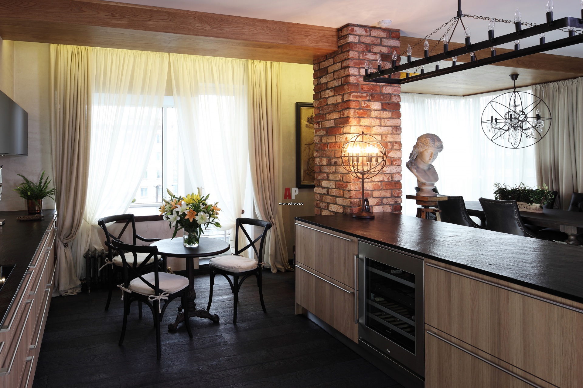 Зона для завтраков на кухне. Со светлым деревом кухонной мебели и потолочных панелей контрастирует инженерная половая доска.