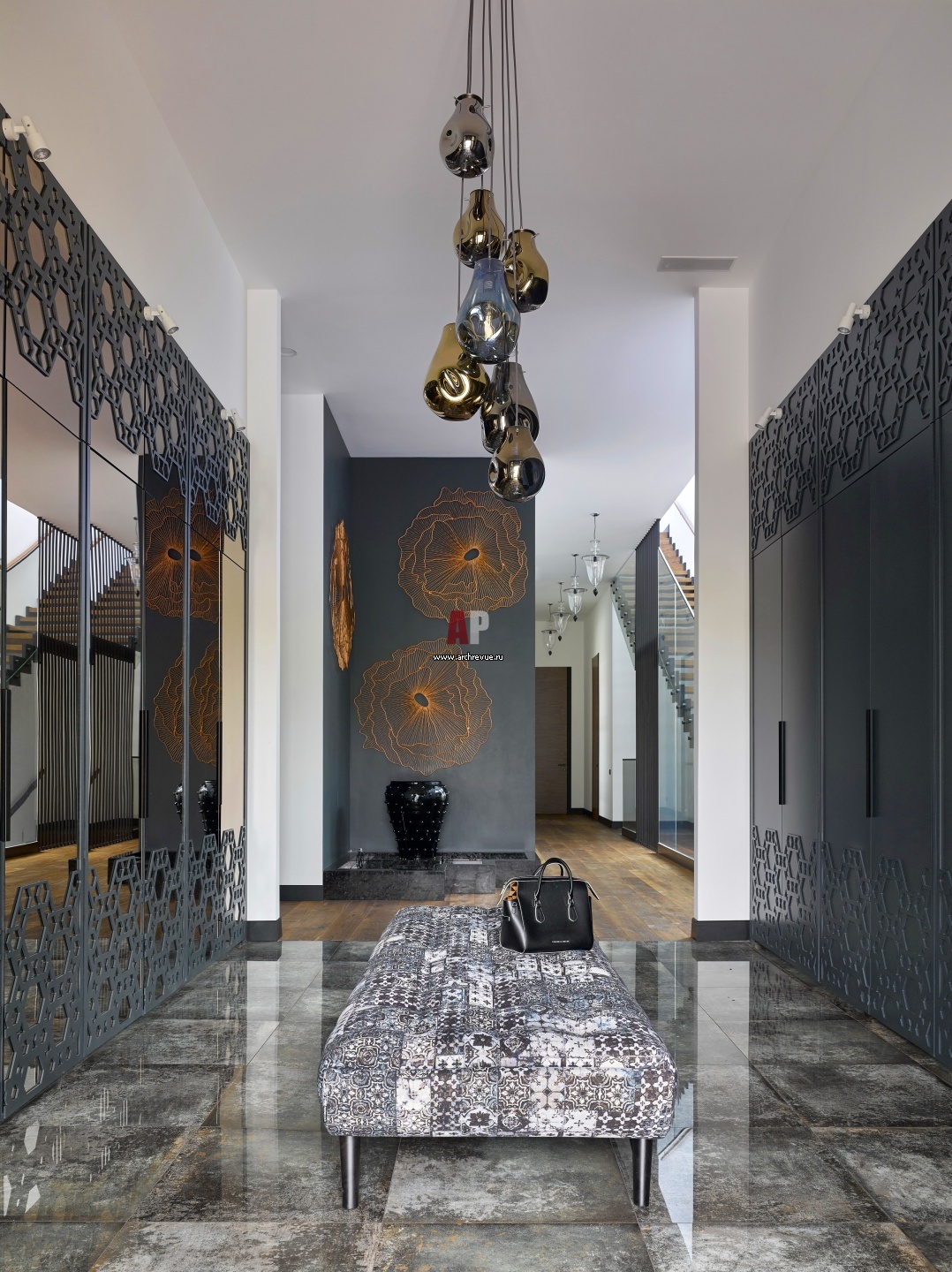 Холл первого этажа. Пол выложен глянцевым керамогранитом, зеркальные шкафы с этническим орнаментом выполнены на заказ. Акцент сделан на фонтан: водная композиция с большой керамической вазой глубокого синего цвета добавляет красоты и умиротворяет. Пространство масштабируют настенные панно из металла, Phillips Collection.