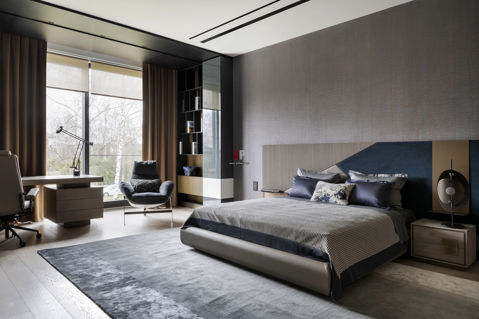 Апартаменты сына. Комната сына оформлена в сложной цветовой гамме: приглушенно синие, серые, горчичные и бронзовые тона в ней сочетаются с белыми лаковыми акцентами. Кровать, Shake Design. Кресло, Arketipo. Обои, Tiffany Design.