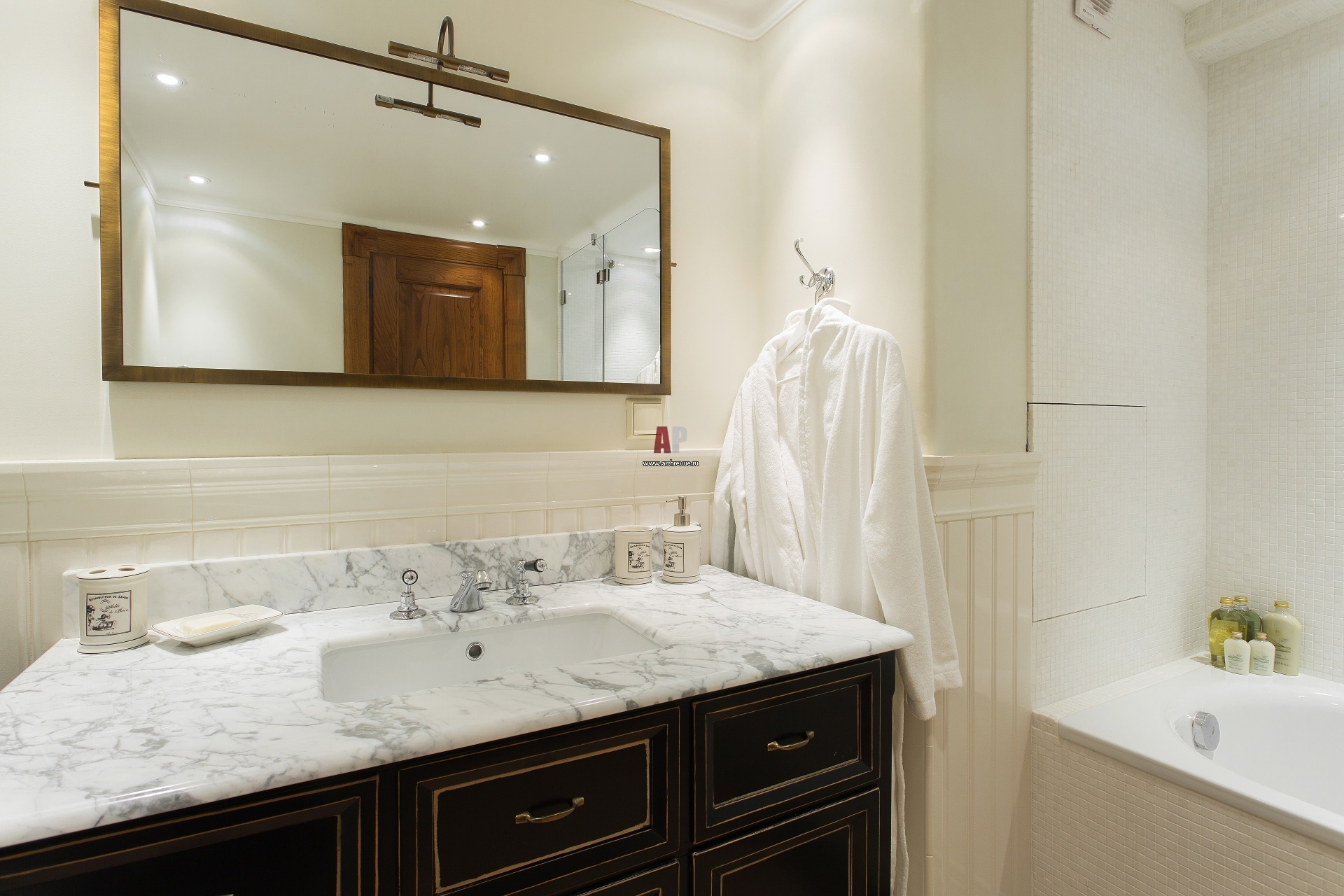 Хозяйская ванная комната – самое светлое помещение в доме. Стены облицованы светлой керамикой, Petracer’s. Умывальник сделан на заказ. Столешница из белого с серыми прожилками мрамора.