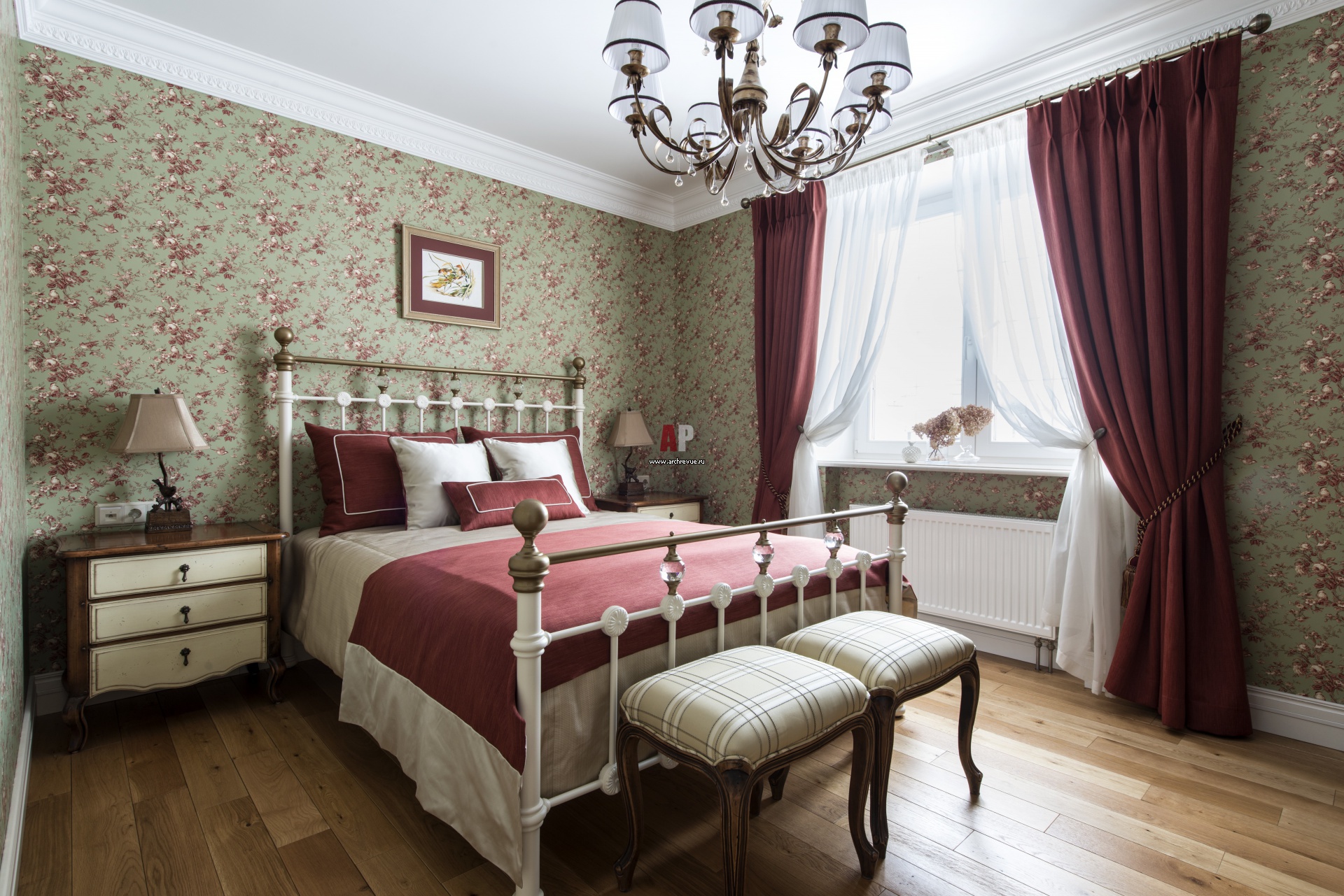 Интерьер спальни в зеленовато-бордовых тонах. Английские обои с цветочным орнаментом. Над кроватью с металлической фурнитурой – вышитое панно с изображением птиц работы хозяйки дома.
