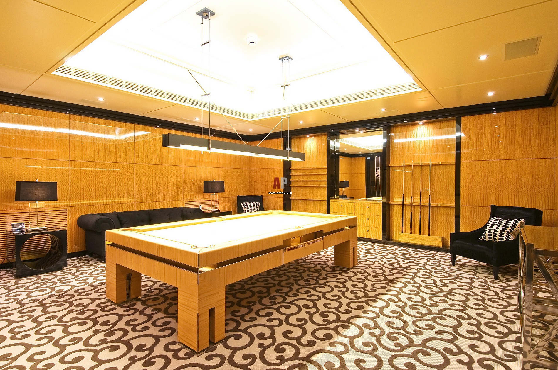 К зоне отдыха примыкает бильярдная. Стены бильярдной облицованы панелями из лимонника под глянцевым лаком. Из этого же дерева сделан бильярдный стол Tresserra.