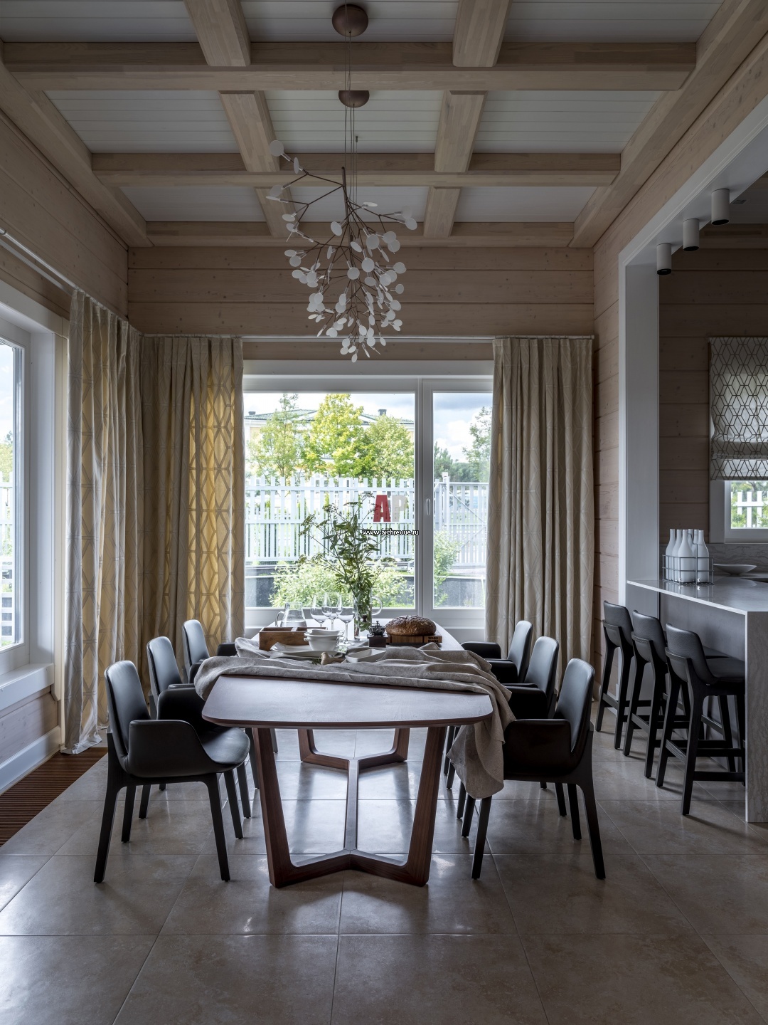Обеденная группа с выходом на террасу. Обеденный стол, Poliform, модель Concorde. Стулья, Poliform, модель Ventura. Светильник над столом, MOOOI, модель Heracleum Endless. На полу – керамогранит под травертин.