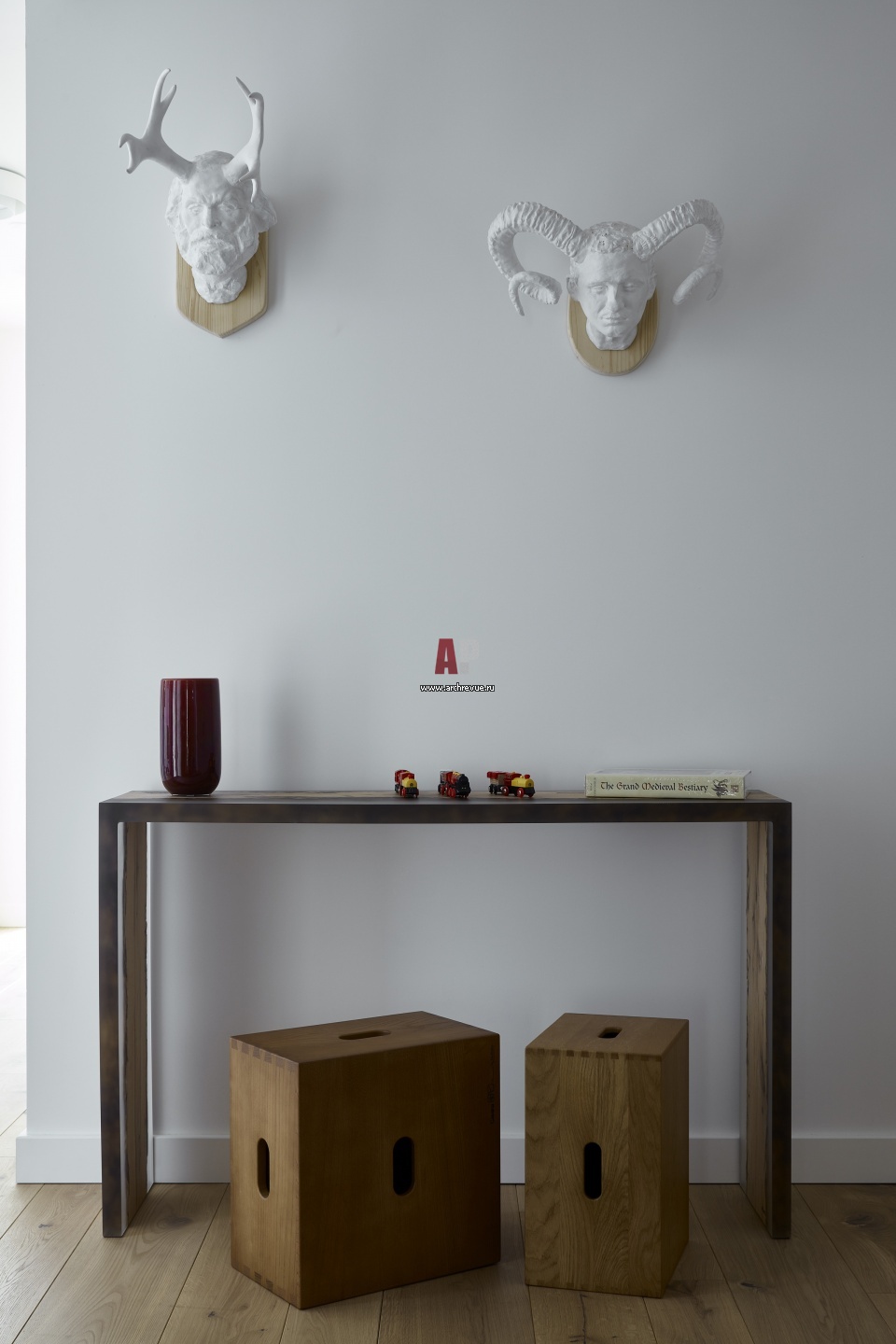 Холл. Консоль выполнена из дерева, которое было частью сваи в Венецианской лагуне, Alcarol, модель Bent Console. Деревянные табуреты, Cassina, модель LC14 по дизайну Ле Корбюзье. На стене – Карл Маркс и Ги Дебор из серии «Предательство интеллектуалов» Дианы Мачулиной.