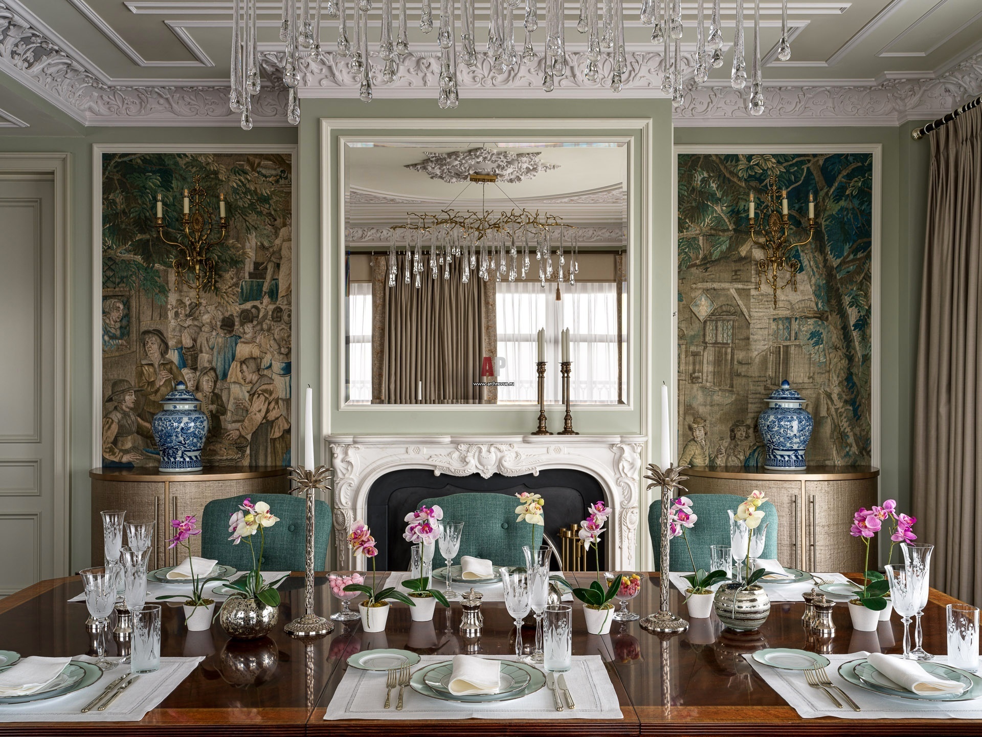Столовая группа с камином. Камин из светлого камня с изысканной резьбой обрамляют гобелены с единым рисунком. Зеркало над камином визуально расширяет пространство.