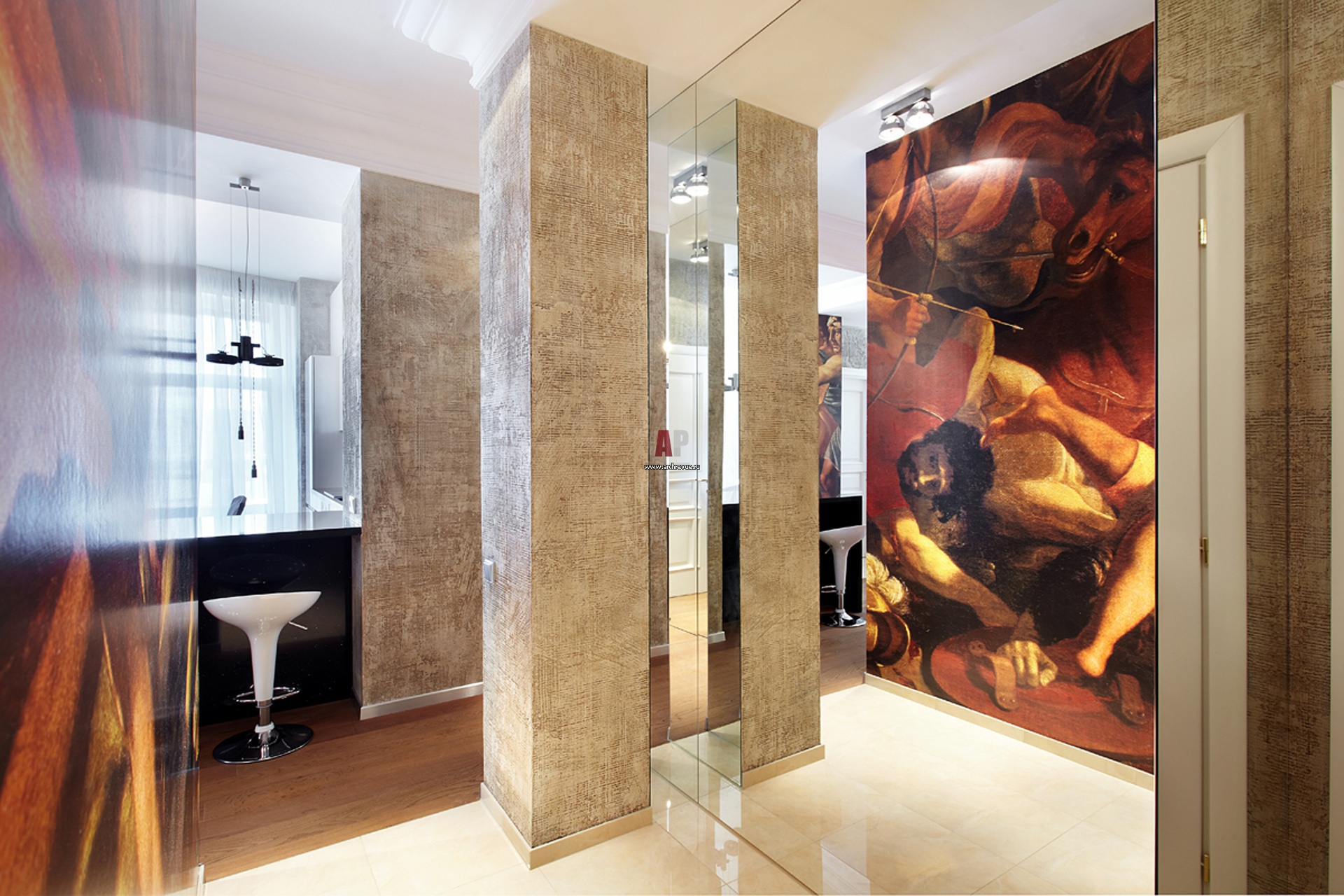 Чтобы создать ощущение простора в этом интерьере, использованы зеркала и «фрески». Они сбивают масштаб, корректируют сложную геометрию и придают интерьеру художественную выразительность.