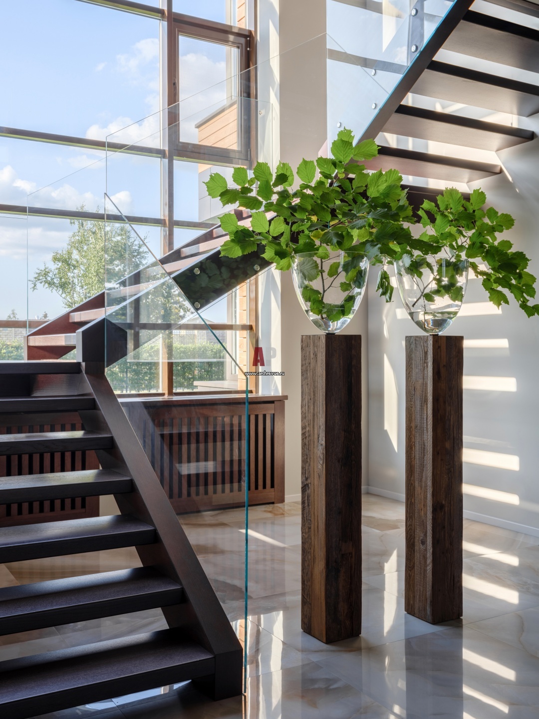При выборе лестницы ставка была сделана на максимально облегченную конструкцию с работающими на просвет ступенями и стеклянным ограждением без перил. Было важно, чтобы ничто не перекрывало панорамное окно, и свет мог свободно литься внутрь интерьера.