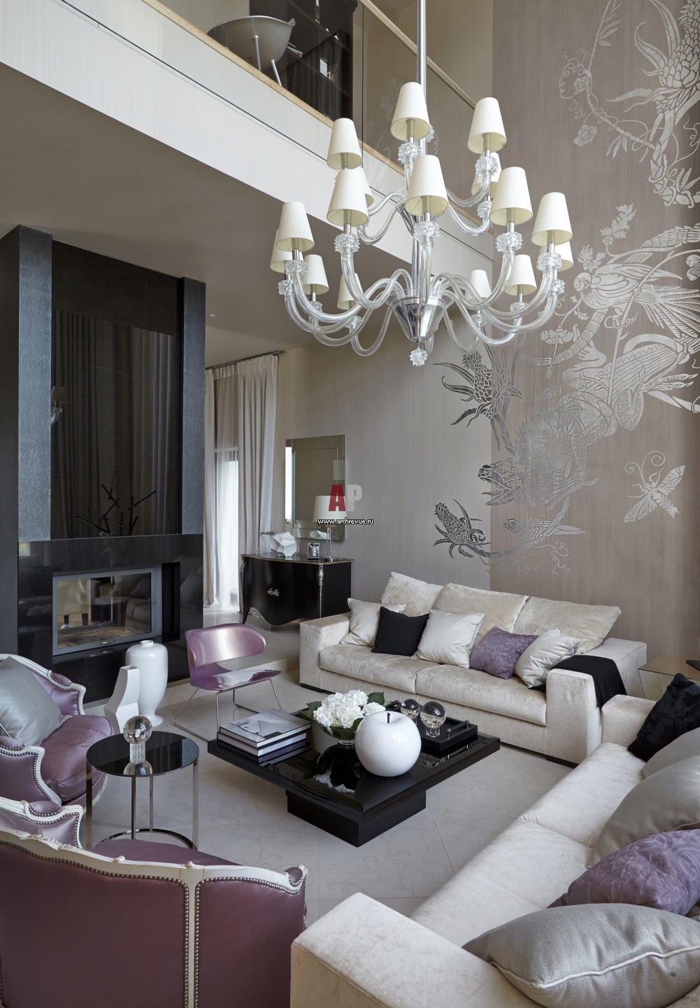 Стена двухуровневой гостиной украшена панно с изображением игуаны. Изысканный настенный декор служит связующей нитью между лаконичными предметами в стиле ар-деко и мебелью в духе французской неоклассики.