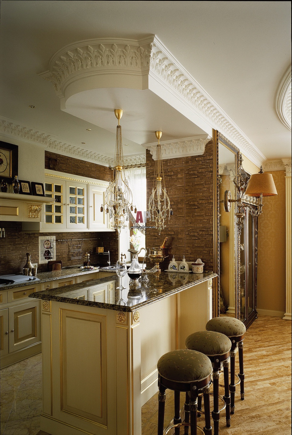 Барная стойка решена в классике. Ее форму дублирует лепной потолок. Высокий гипсовый карниз украшен растительным орнаментом, поставщик «Петергоф».