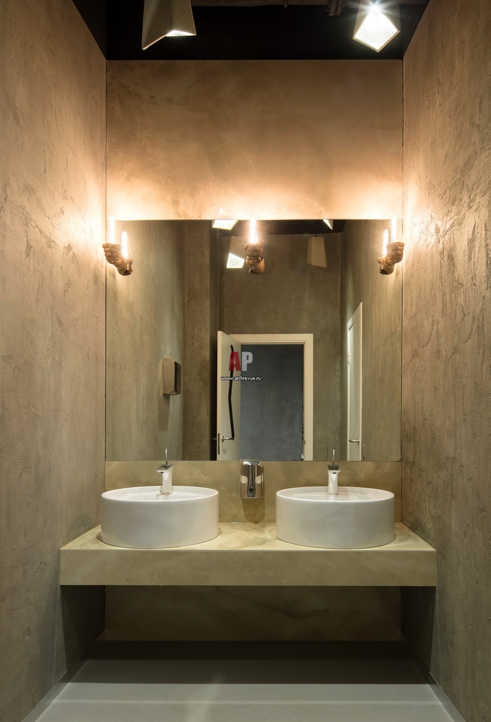 Интерьера санузла. Стены оформлены покрытием под бетон. Сантехника, Ideal Standard, Hansgrohe.