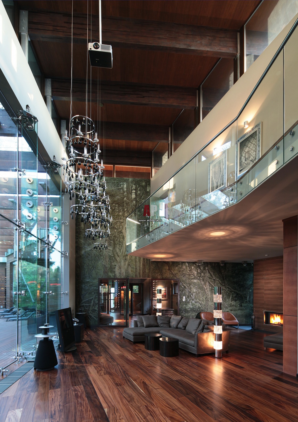 Двухуровневая гостиная в доме в стиле фьюжн. Благодаря панорамному остеклению интерьер выглядит продолжением ландшафта. На полу – массивная доска из древесины табакко. Светильник De Majo Illuminazione.