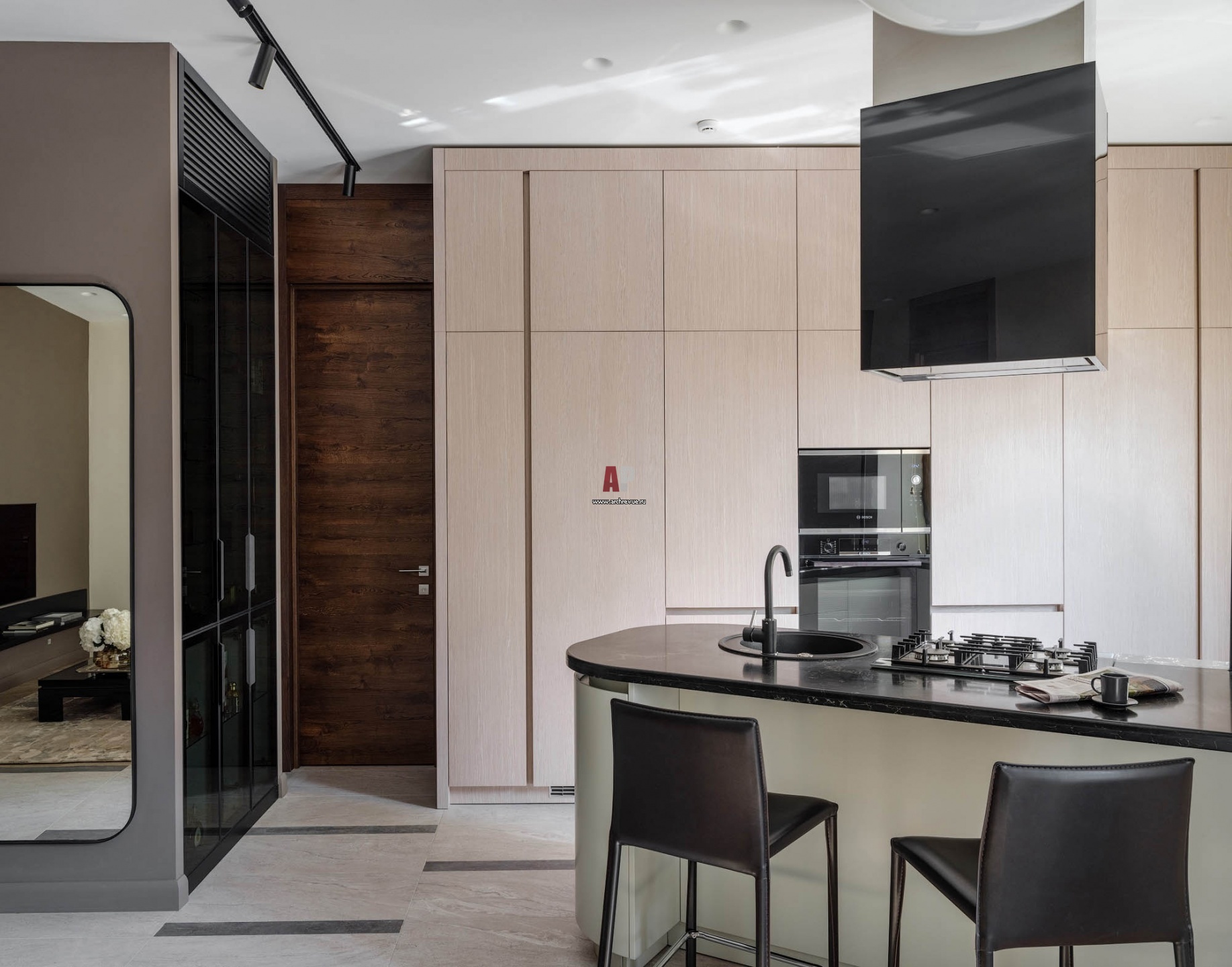 Интерьер кухни, дверь из темного дерева ведет в санузел. Слева находится шкаф с тонированными полупрозрачными стеклянными дверцами. Он спроектирован для коллекции хозяйки парфюма Guerlain. В верхнем отделении шкафа за жалюзийным фасадом скрывается кондиционер, он поддерживает оптимальную температуру.