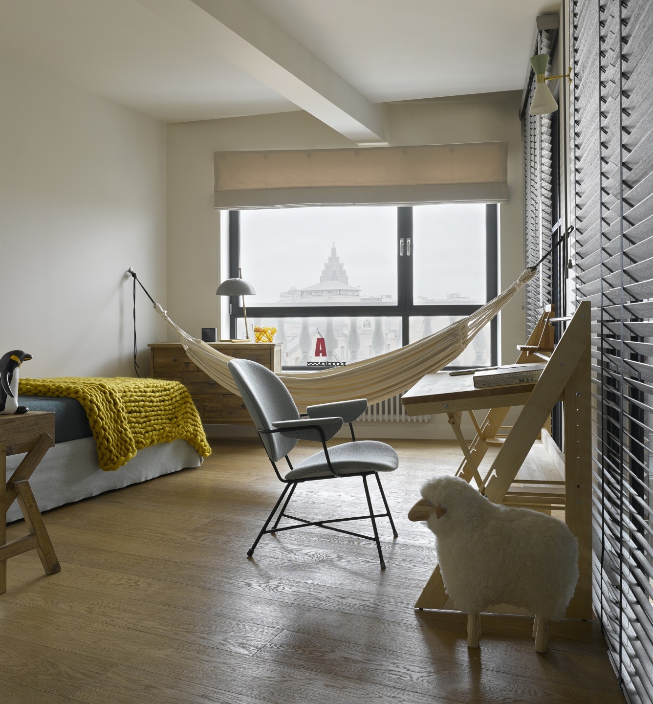 Детская девочки на втором этаже. Кровать, Gervasoni, модель Ghost. Тумбочка и комод, Dialma Brown. Кресло, винтаж.