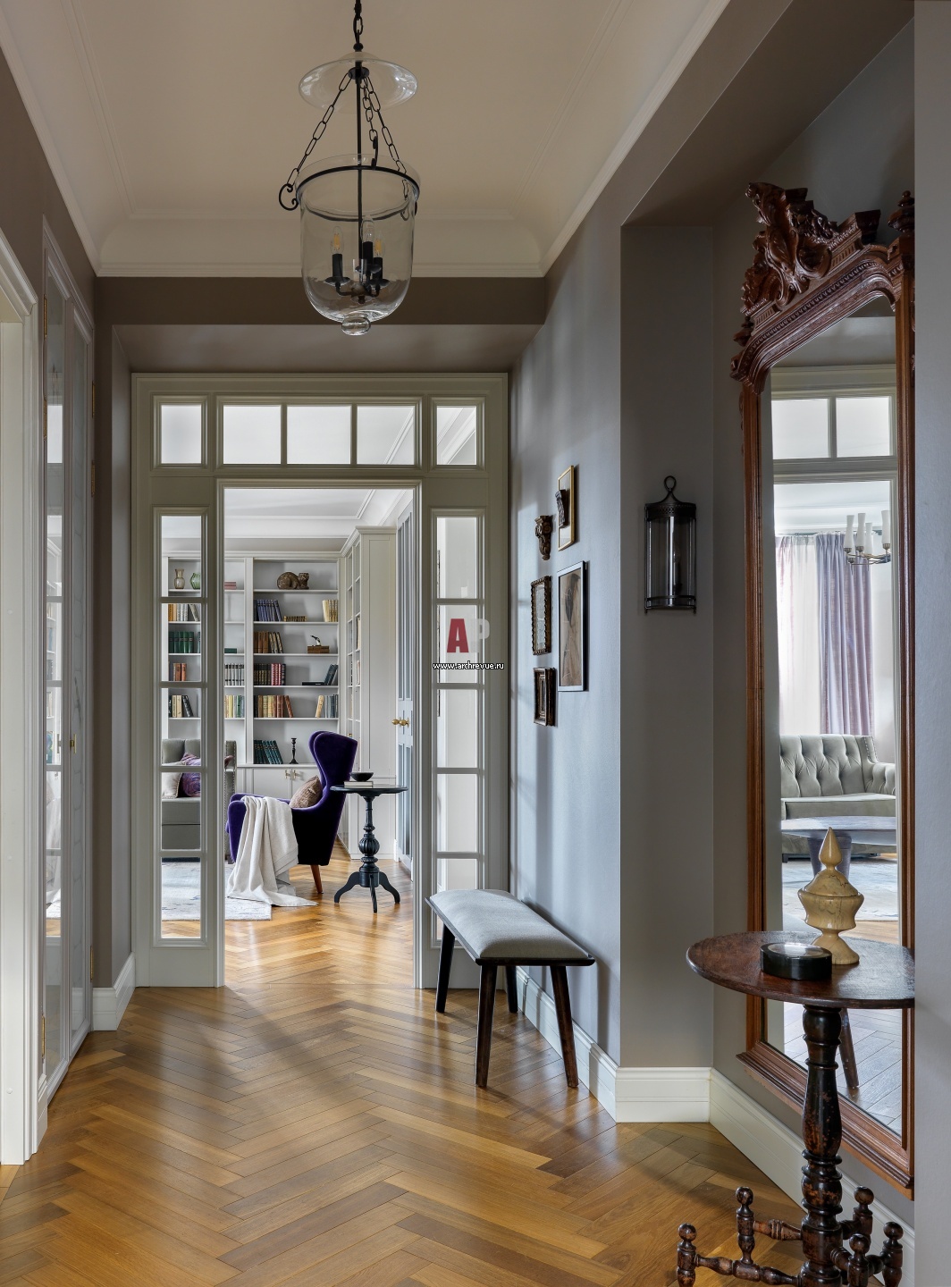 Масштаб и парадность в прихожей задают большое антикварное зеркало, а также стеклянный филенчатый портал, ведущий в гостиную. Гравюры, рисунки и декор куплены в антикварных лавках и на блошином рынке.