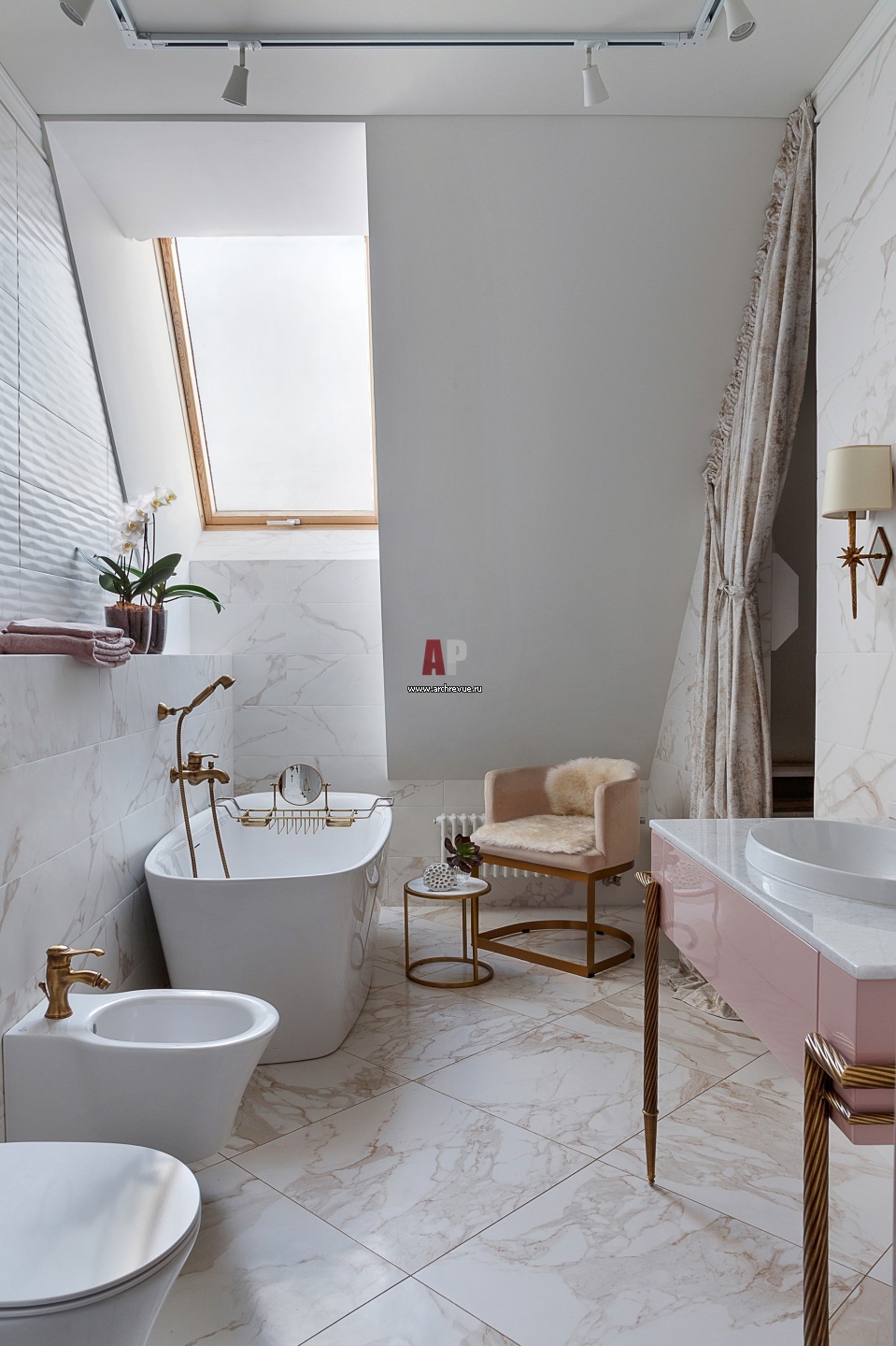 Хозяйская ванная комната с мансардным окном. Ванна, унитаз, биде, раковина, Ideal Standard. Кресло, Kare Design.
