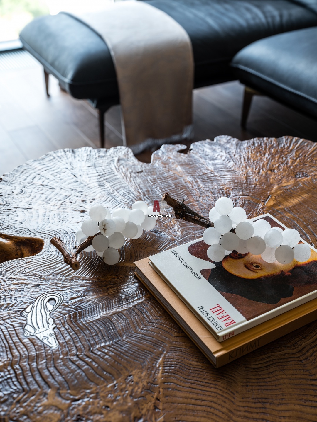 Журнальный стол Bizzotto из спила корня благородных пород дерева собрал вокруг себя всю композицию гостиной.