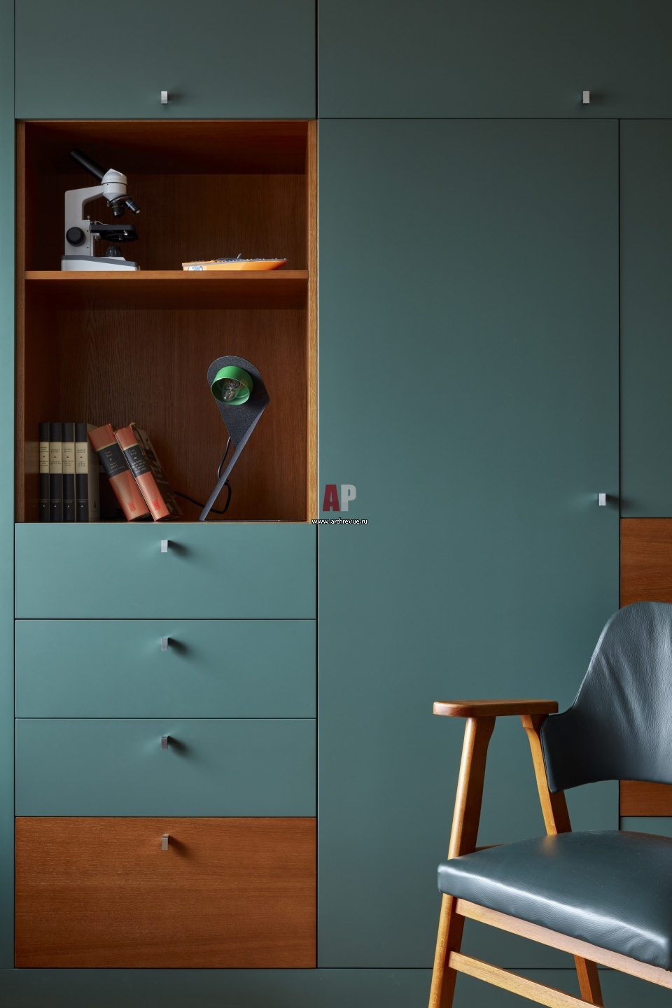 Трехэтажный пентхаус со сложной архитектурой и дизайном в стиле ретро. Интерьер спальни мальчика. Цветной стеллаж сделан на заказ, изготовление, «Ассоциация русских мастеров».