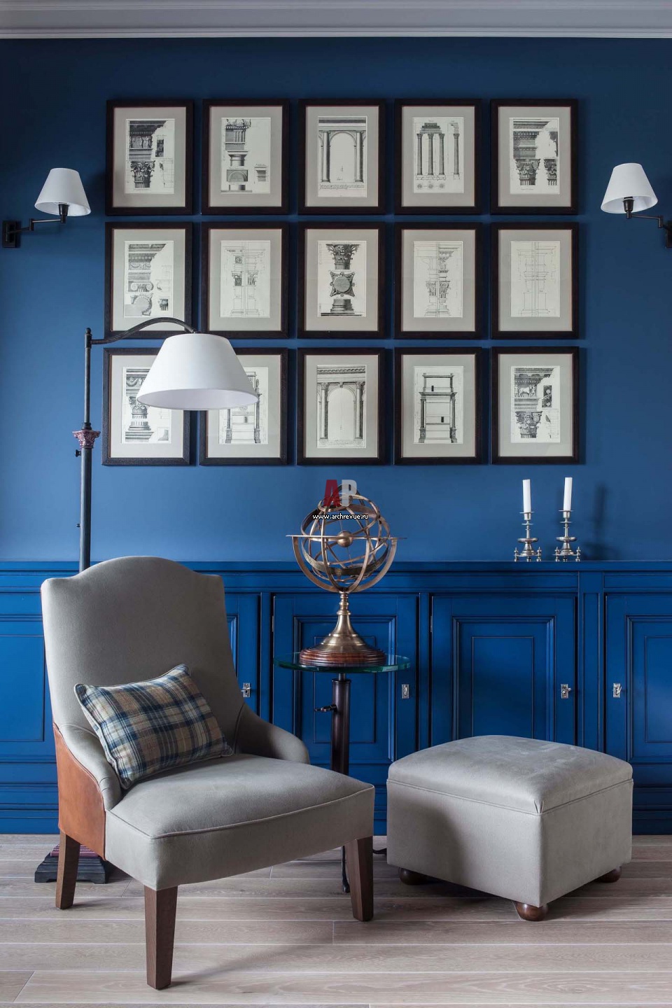 Фото дизайна интерьера кабинета в насыщенных синих тонах. На синих стенах выигрышно смотрятся старинные архитектурные гравюры. Мебель в стиле фьюжн.