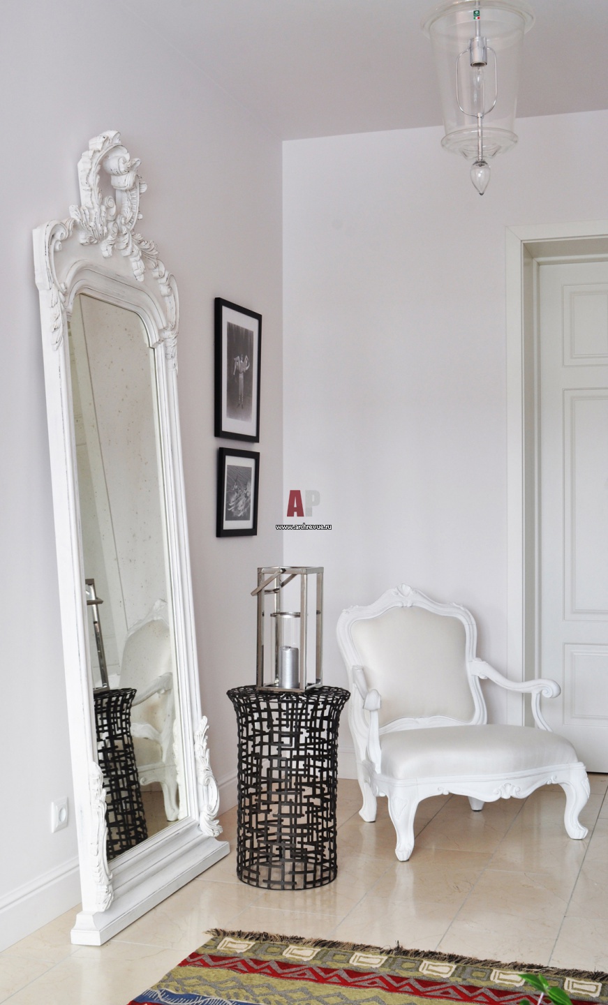 Интерьер прихожей. Кресло и зеркало в неоклассике. На полу – слэбы из травертина.
