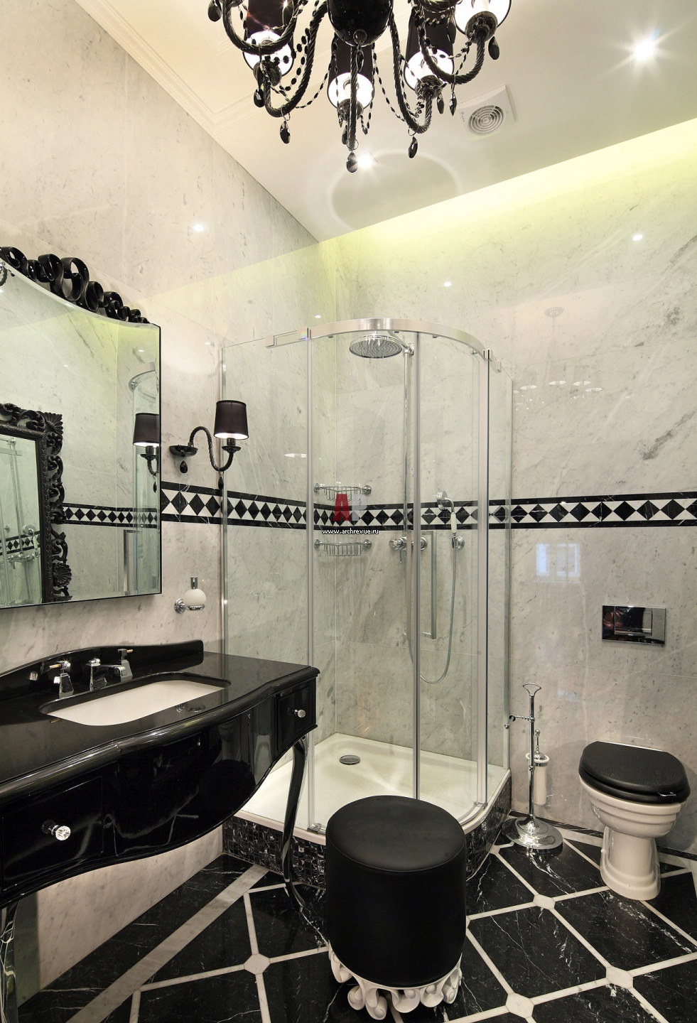 Черно-белый санузел. На полу и стенах – мрамор. Умывальник с черной столешницей и хромированными ножками, Devon & Devon.