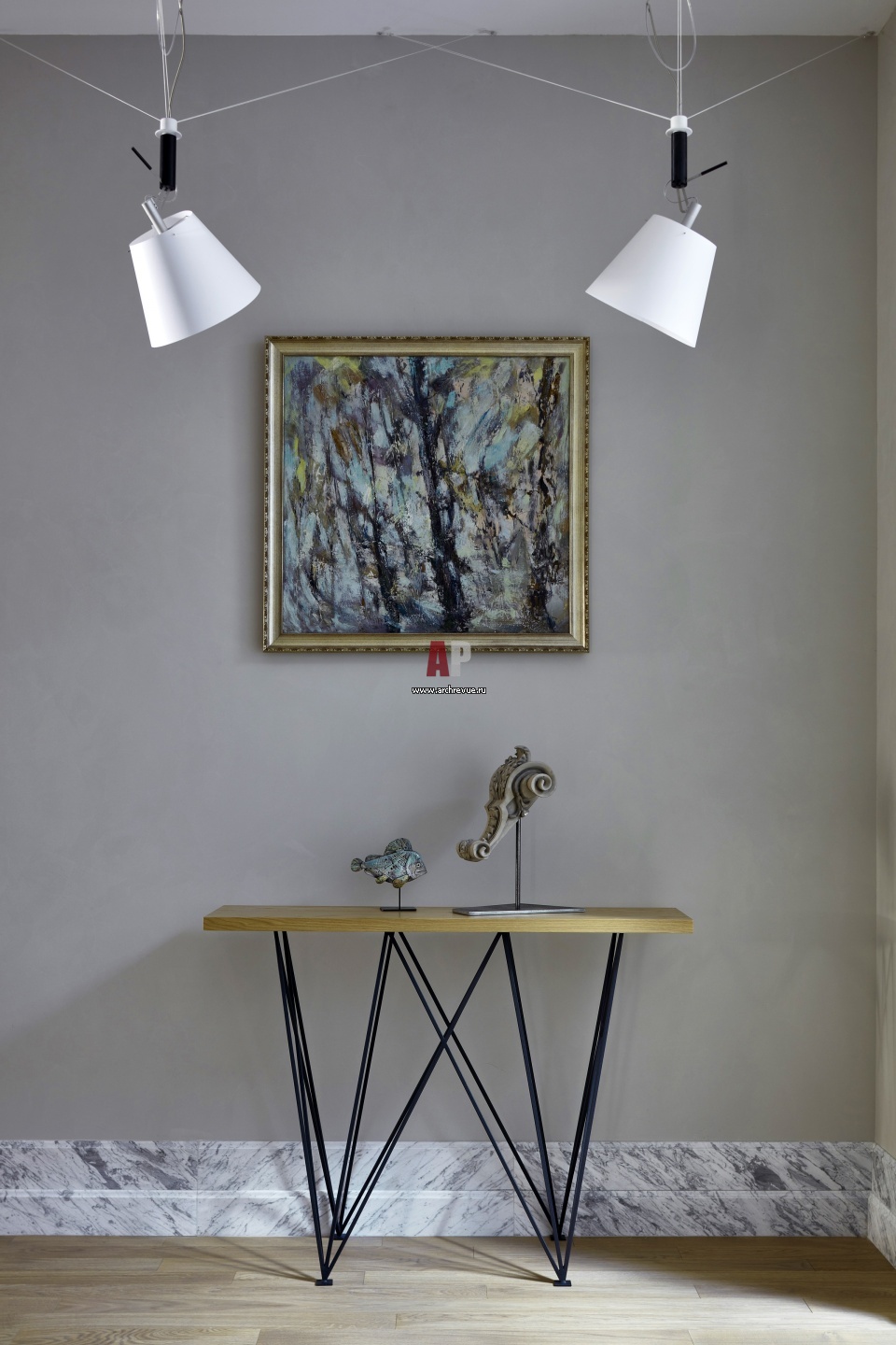 Эклектичный дом с видом на горы. Интерьер прихожей. Консоль на тонких металлических опорах выполнена на заказ. Светильники, Ingo Maurer.