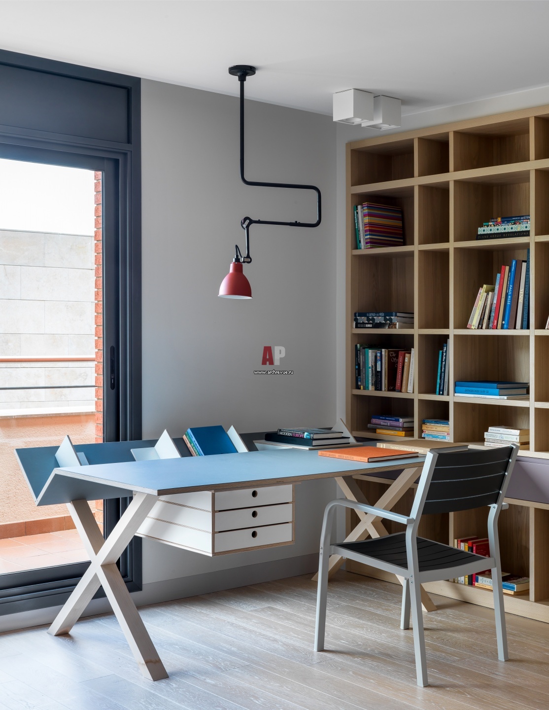 Между спальней и кабинетом нет глухих дверей, Зоны разделяет перегородка с системой хранения. Стеллаж и рабочее место в скандинавском стиле сделаны на заказ по эскизам архитекторов. Над столом – светильник, La Lampe Gras, модель N°312.