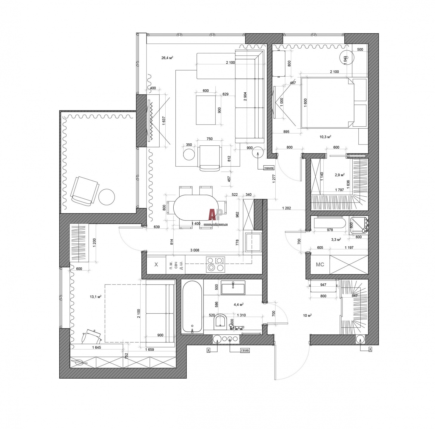 План трехкомнатной квартиры с панорамными окнами для временного проживания.