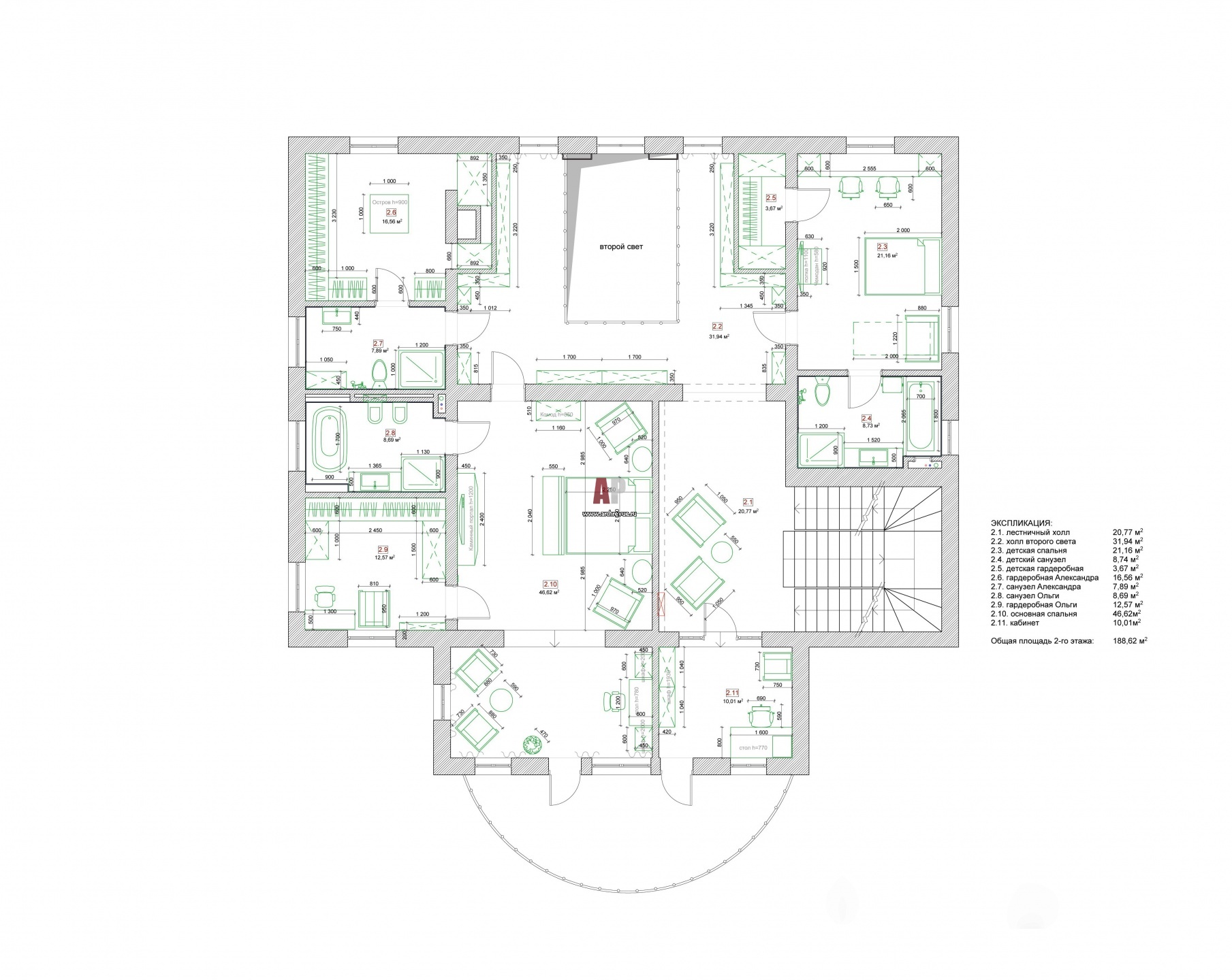 Планировка 2 этажа 3-х этажного дома. Общая площадь – 720 кв. м.