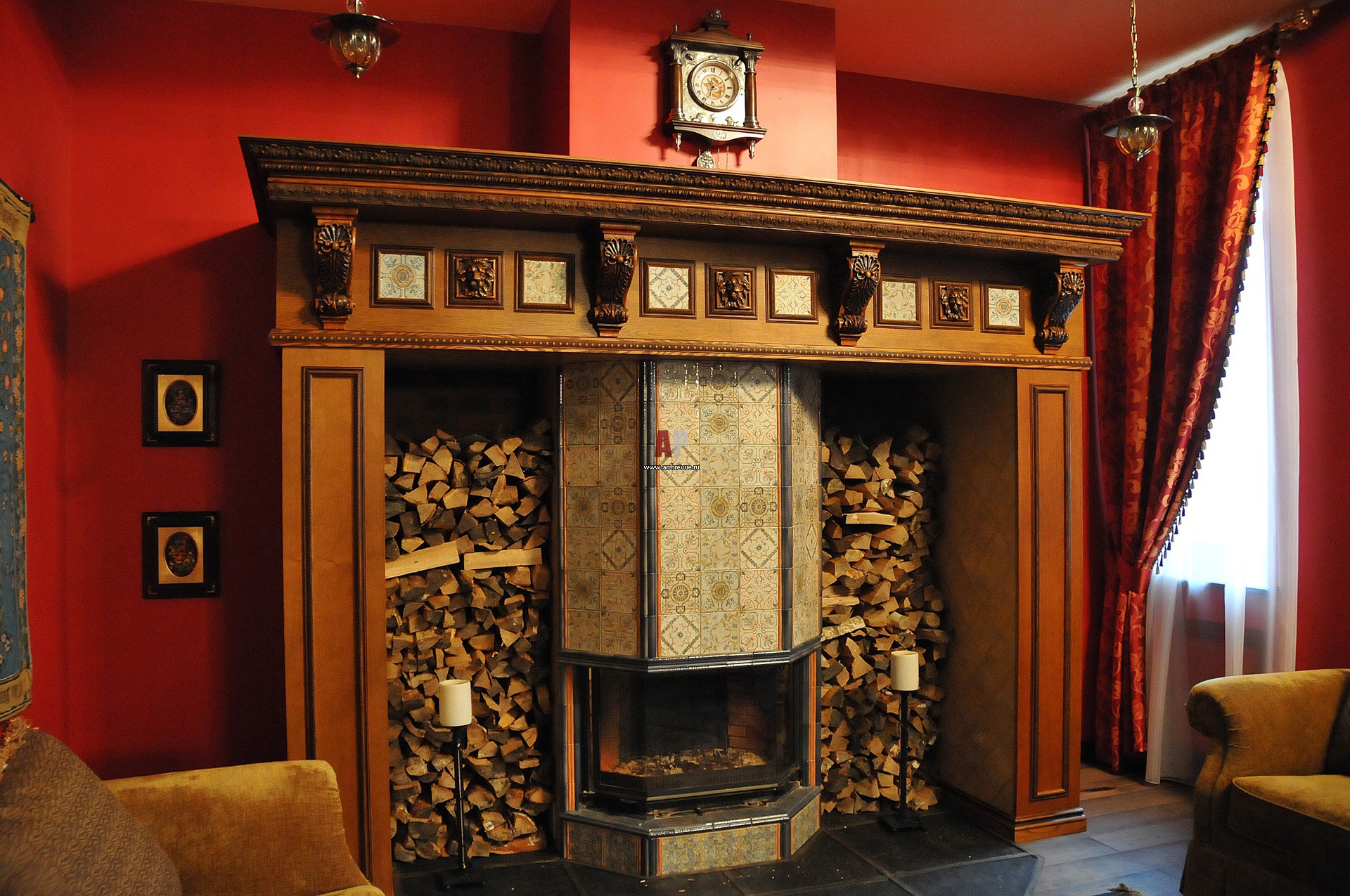 Фото дизайна классического камина. Портал камина, дуб, с резьбой и керамическими вставками, компания GRANDECOR.