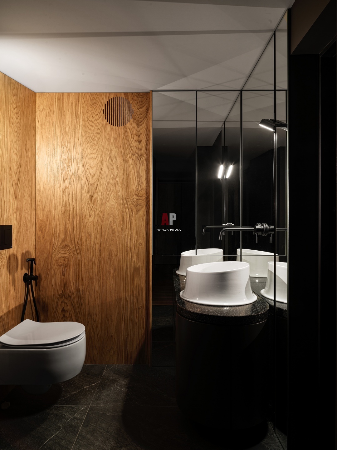 Санузел второго этажа с приглушенным освещением. Напольная раковина, Kerasan, Artwork Barrel.