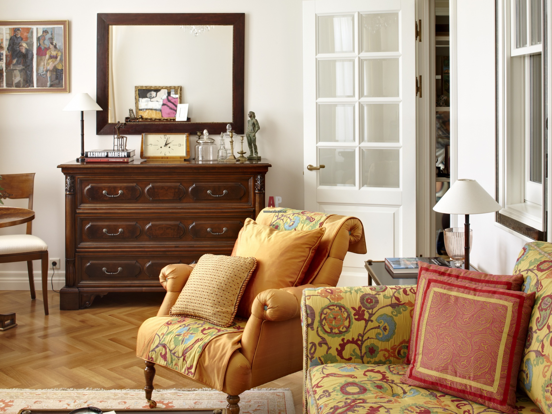 Дизайн интерьера гостиной с белыми стенами. Диван и кресло в гостиной – вещи с историей: прежде чем стать доминантами нового интерьера, их отреставрировали и перетянули обивку, используя ткани из коллекции Etro. За декоративным окном находится изолированная кухня.