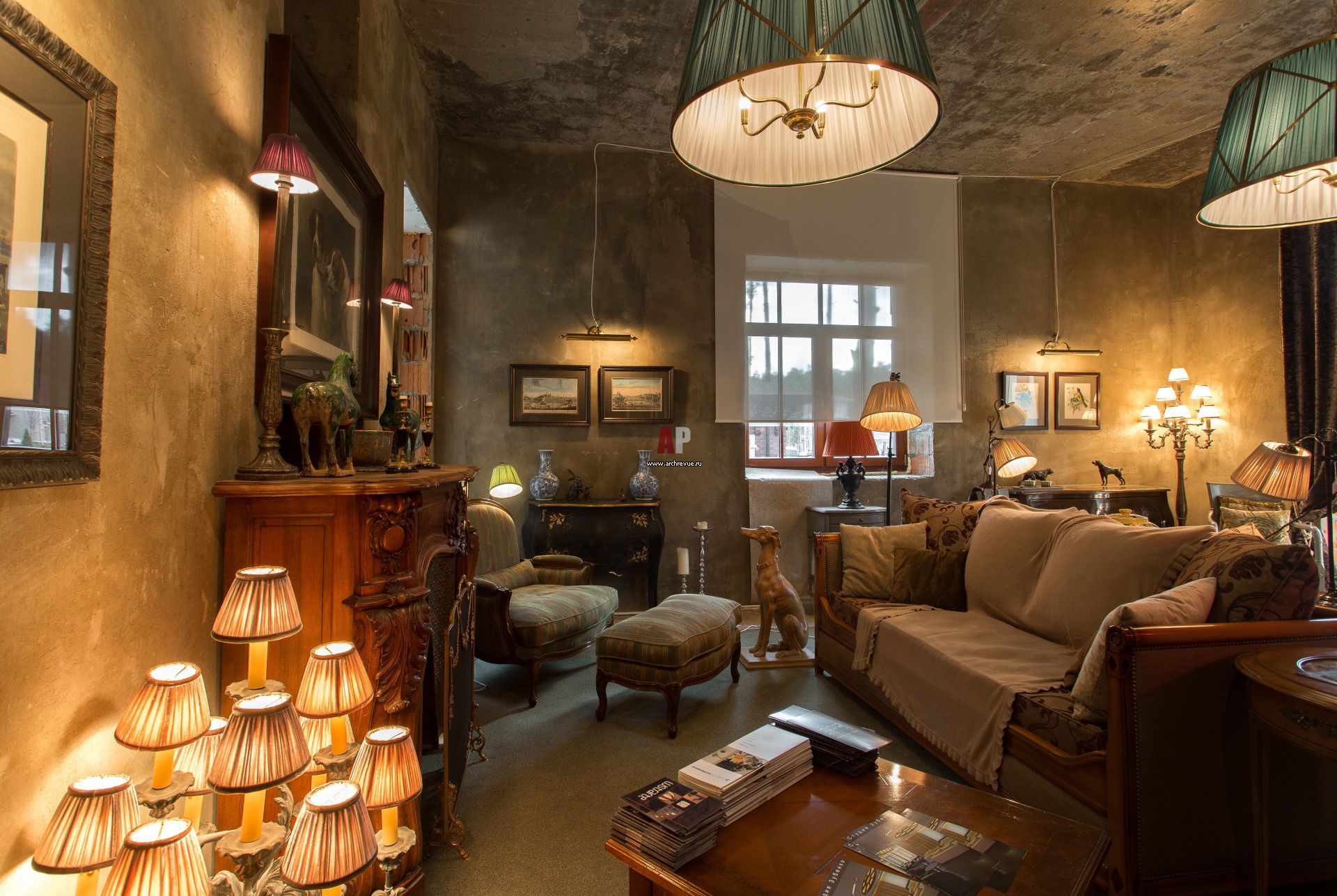 Интерьер в богемном духе. Фото гостиной с антикварным камином. Люстры, торшеры, бра с абажурами из красной и зеленой ткани, Arizzi.