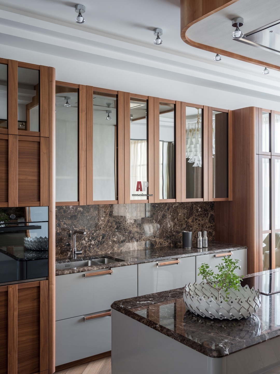 Интерьер кухни с элементами гламура и ретро. Кухня, Composit. Вытяжка над островом встроена в обтекаемую навесную конструкцию, зашитую шпонированным деревом.