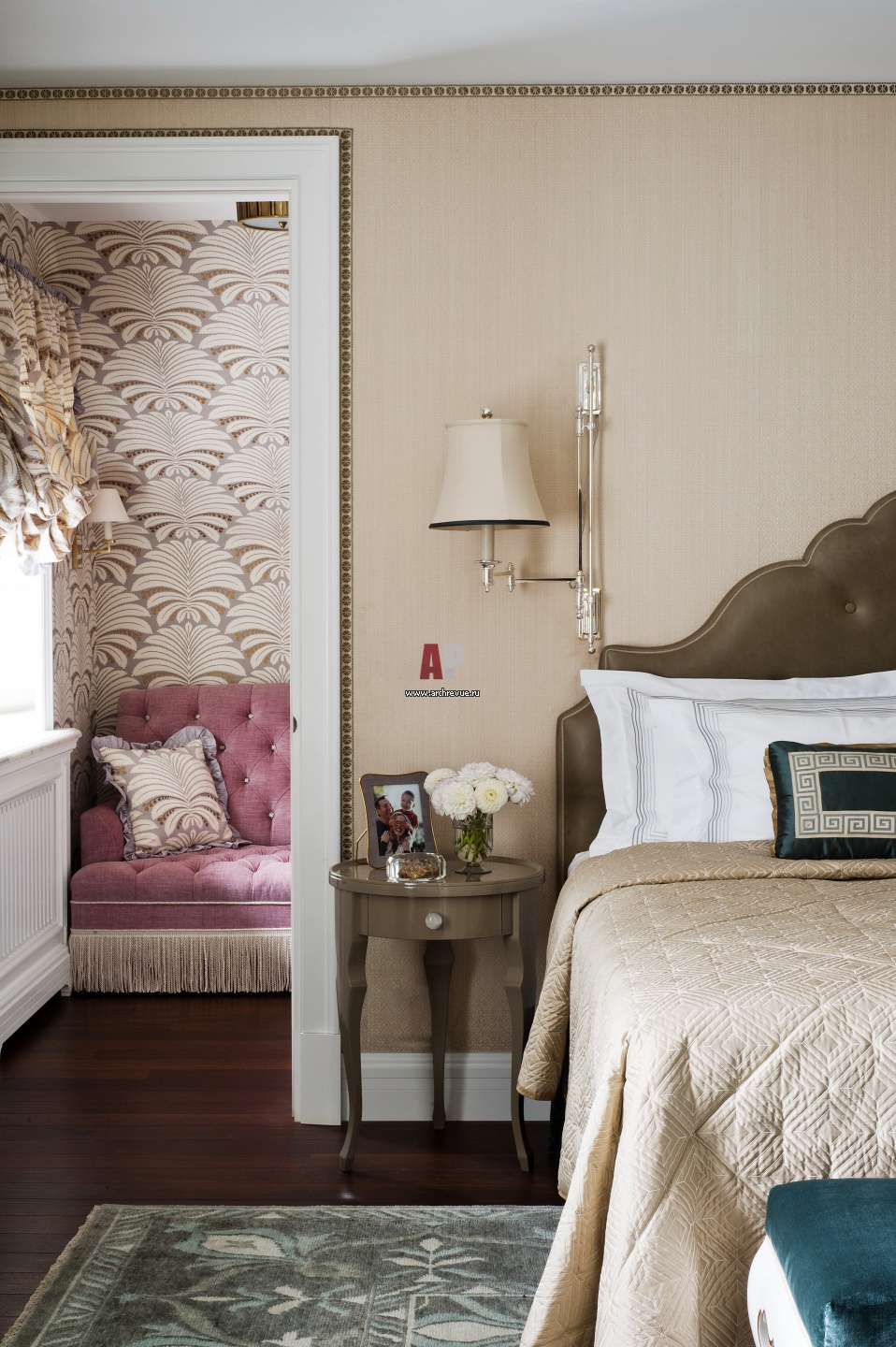 Вид из спальни на смежное помещение гардеробной и будуара. Диван сделан на заказ, обивка от Duralee. Бра, Ralph Lauren.