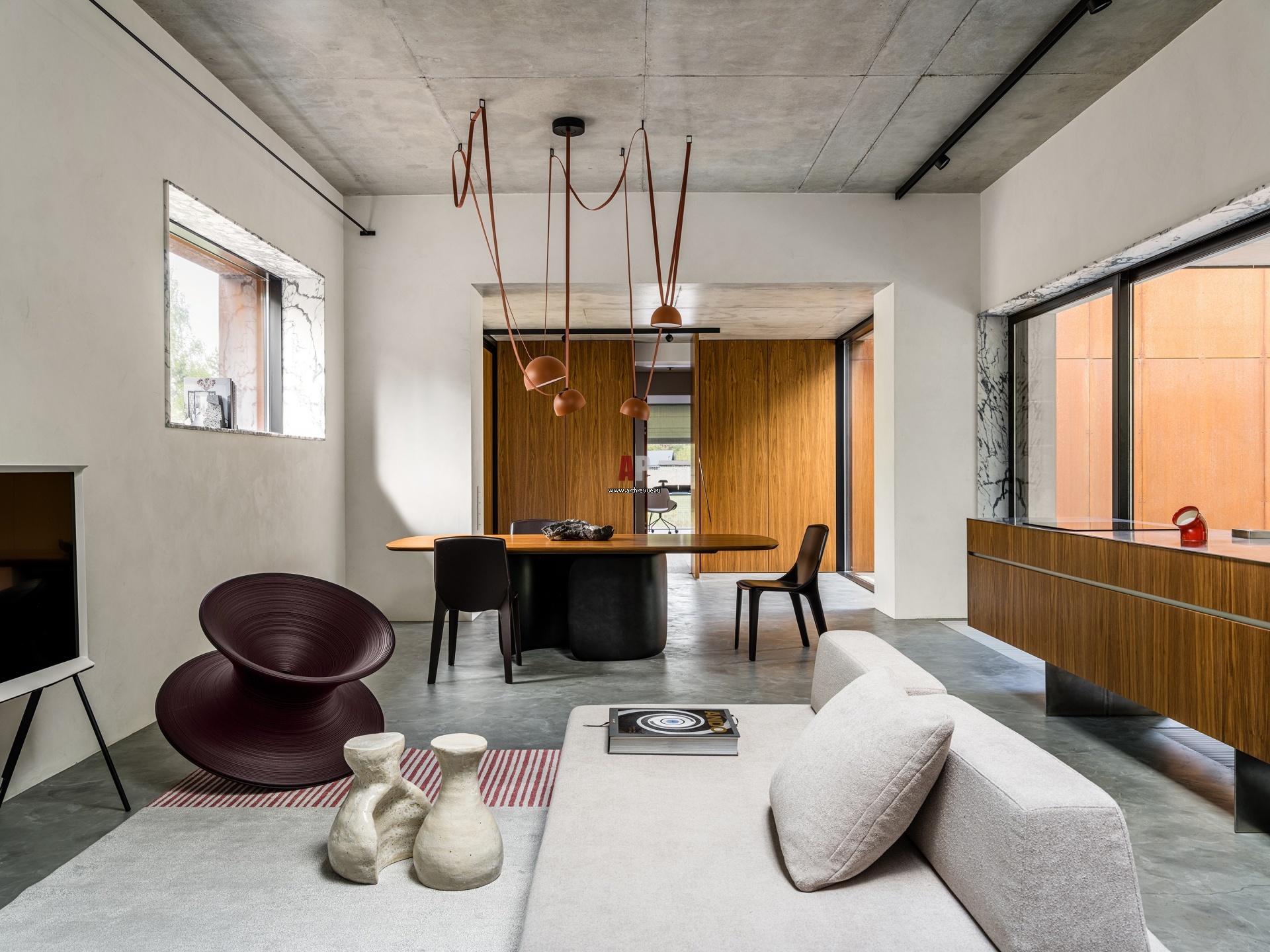 Гостиная-столовая. Откосы окон общественного объема отделаны итальянским мрамором Arabescato.