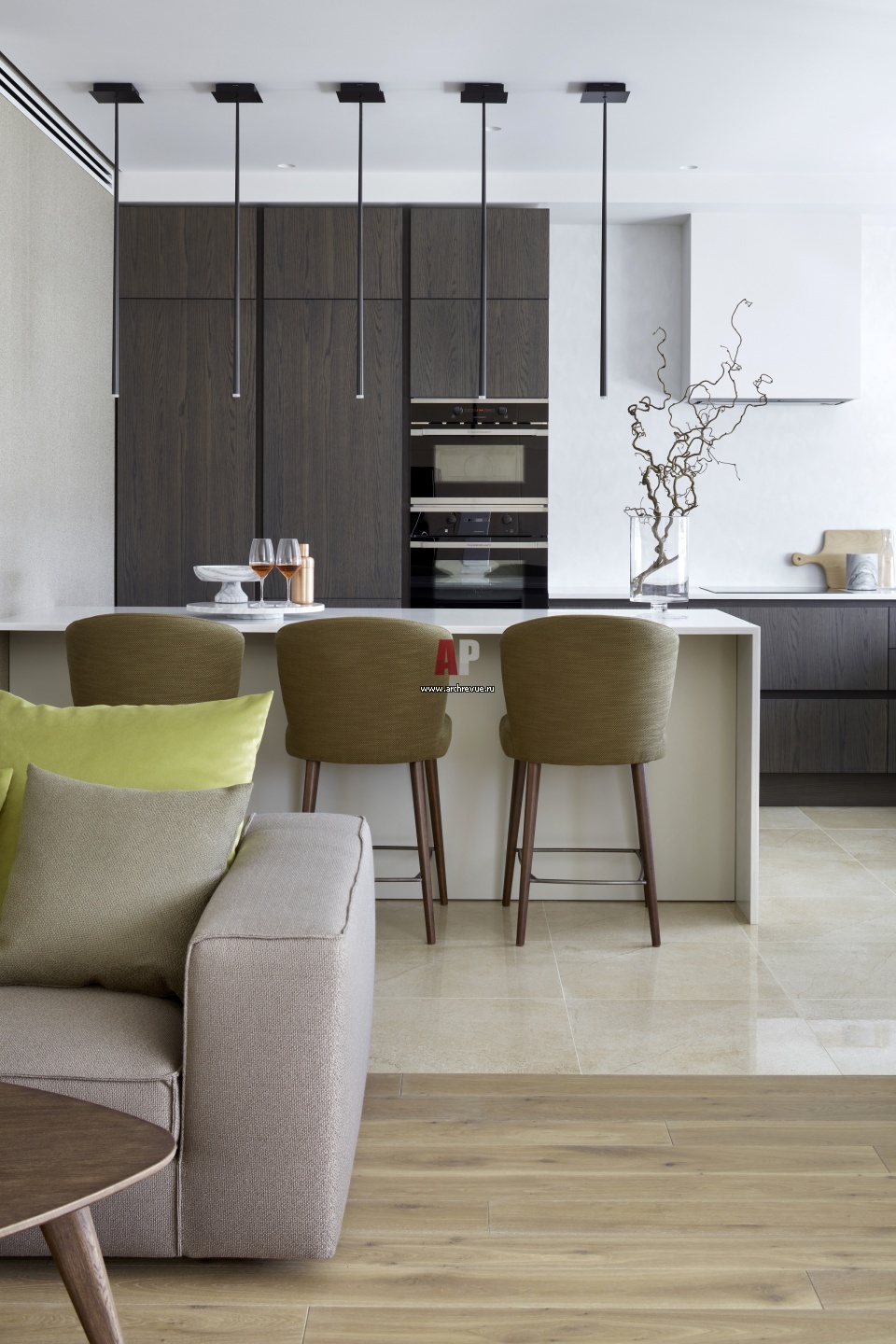 Кухня в общей гостиной. На полу – керамогранит, Italon. Барные стулья сделаны на заказ.
