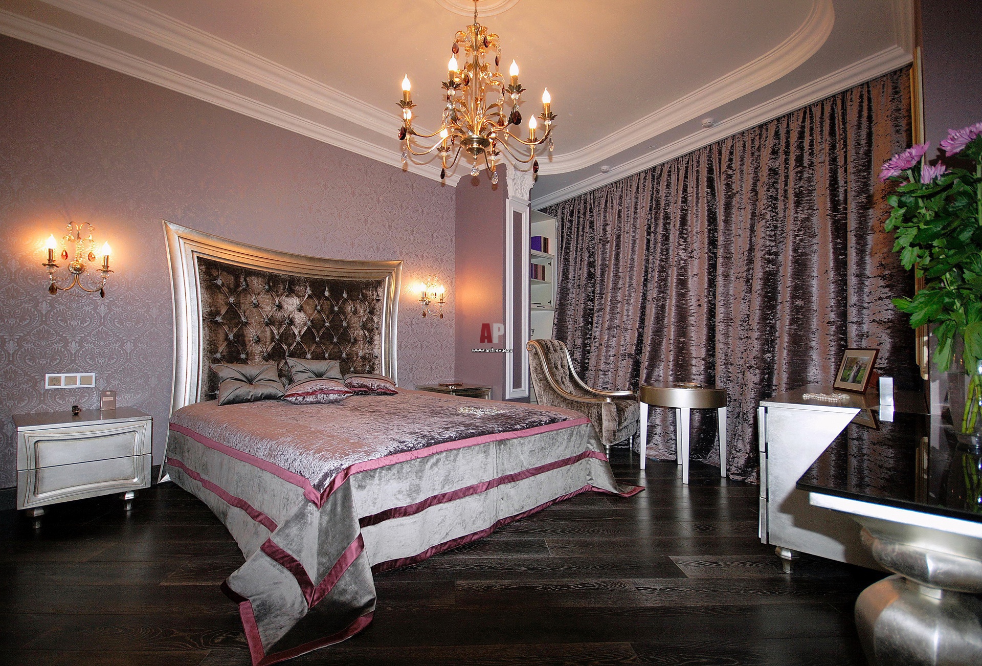 Спальня в стиле фьюжн в бежево-лиловых тонах. В интерьере спальни также использованы классические лепные пилястры. Обои Eijffinger, поставщик «Ампир Декор».
