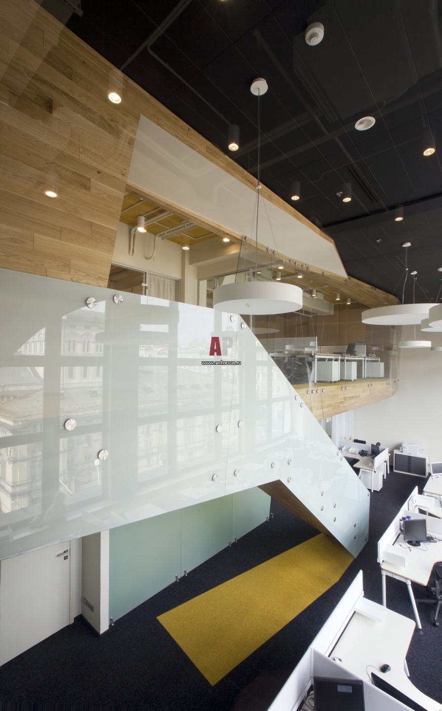 Лестница и галерея решены как единое целое. Авторы проекта Петр Зайцев, Арсений Борисенко, архитектурное бюро za bor. Ограждение лестницы выполнено из матового стекла.