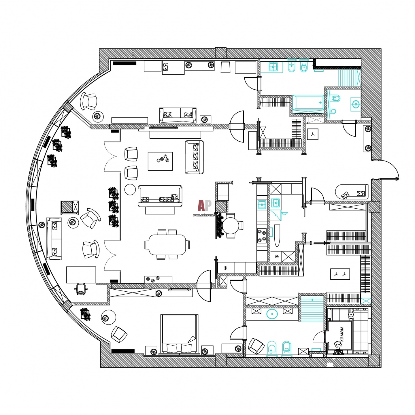 План квартиры с полукруглой террасой. Общая площадь – 270 кв. м.