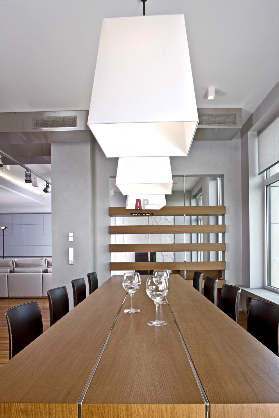 Обеденный стол со столешницей из трех широких досок сделан на заказ по эскизам архитектора. Над ним – три светильника MOOOI.