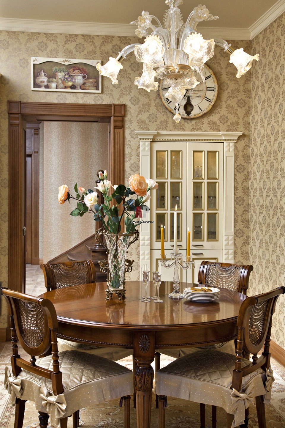 Парадная столовая в стиле неоклассика. Шкаф-витрина из белого дерева встроен в нишу.