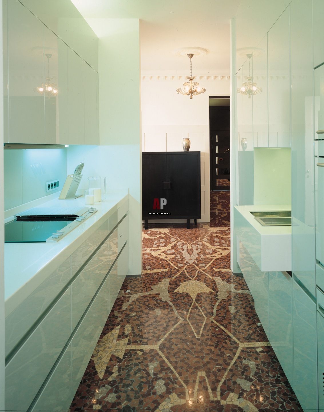 Минималистичная кухня объединена с классической прихожей. Потолок входной зоны украшен гипсовым декором, поставщик «Петергоф». Люстра выполнена по эскизам А. Эрмана, изготовление Artbronze.