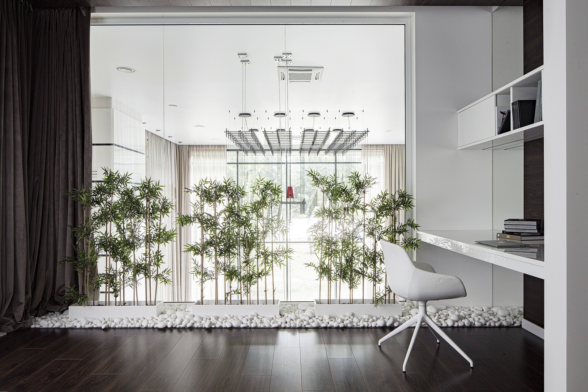 Фишка хозяйской спальни – стеклянная перегородка, через которую открывается вид на двусветную гостиную. Белая галька и живой бамбук в кадках – реверанс в сторону восточной эстетики.